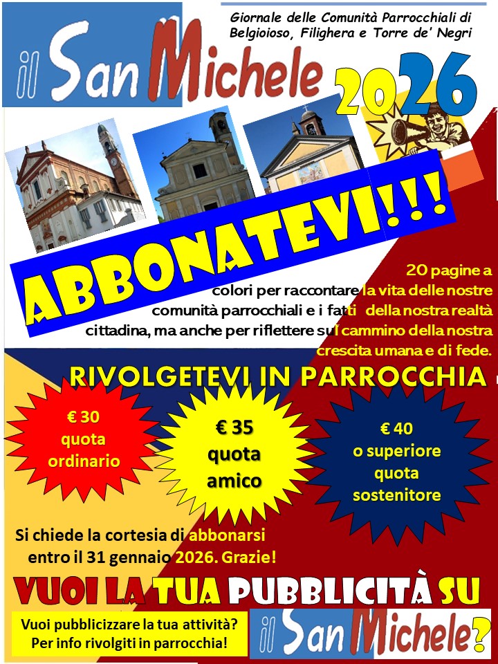 INTENZIONI SANTE MESSE 2026: E’ possibile fissare le intenzioni delle Sante Messe 2026 a ricordo dei propri cari. Rivolgersi al don (Belgioioso) e agli incaricati (Torre e Filighera)