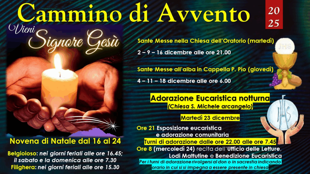 -NOVENA IMMACOLATA: Belgioioso: da sabato 29 novembre a domenica 7 dicembre (recita del S. Rosario: sabato ore 16.30; domenica ore 17.30; feriale ore 16.45); Filighera: recita del S. Rosario prima della S. Messa (ore 15.30)